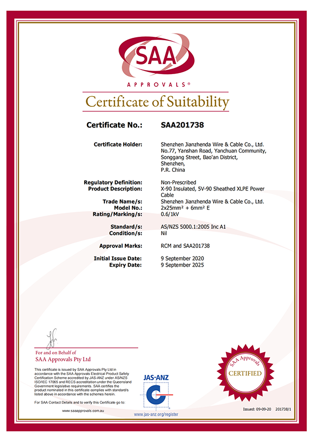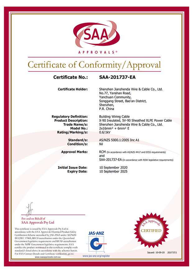 深圳建圳達(dá)電線電纜有限公司,成立于2000年,是一家電線電纜制造商,我們通過了世界各地不同市場(chǎng)的多數(shù)認(rèn)證,如:CCC、RoHS、CB、SAA、TUV、VDE、PSE、BPS、UL、CSA。我們根據(jù)定制產(chǎn)品不斷更新新的認(rèn)證。經(jīng)過數(shù)十年的發(fā)展,我們與來自世界各地的客戶建立了長期的合作關(guān)系。我們?cè)?jīng)是菲律賓機(jī)場(chǎng),,柬埔寨的電力站,美國的醫(yī)院,工廠,埃塞俄比亞的水電站項(xiàng)目。我們是一家值得信賴的電線供應(yīng)商。